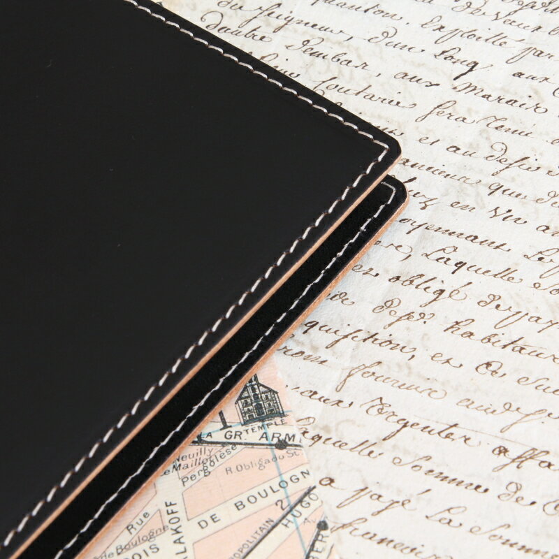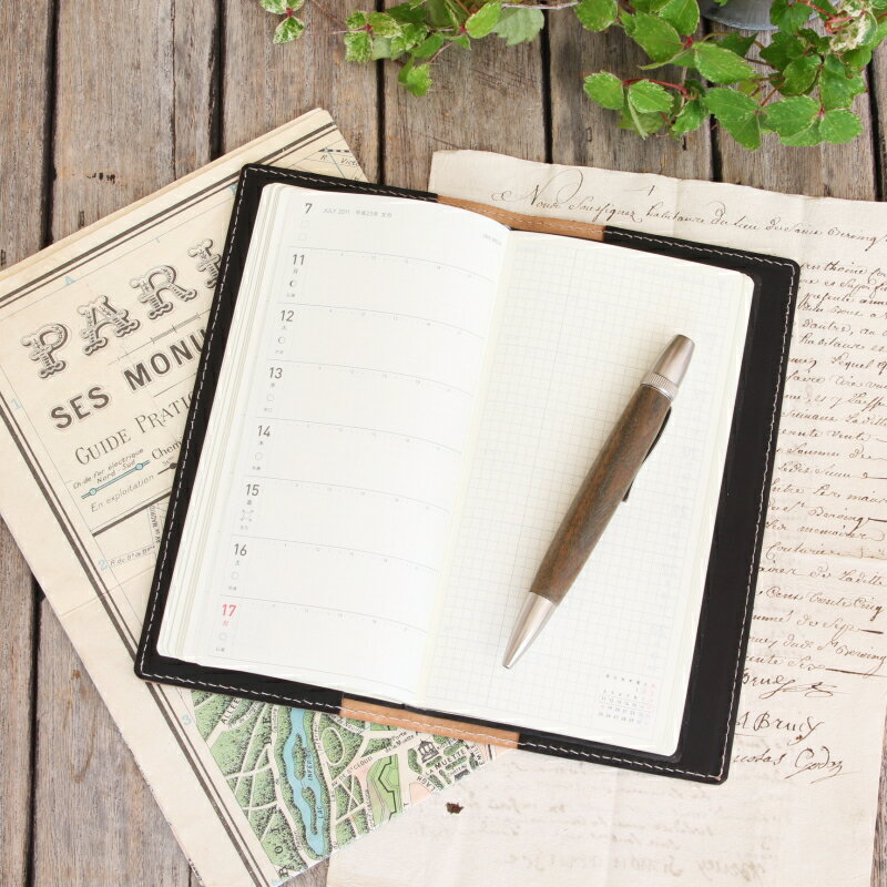 程よい硬さのヌメ革素材で一端的な手帳カバーよりカチッとした仕上がりです。